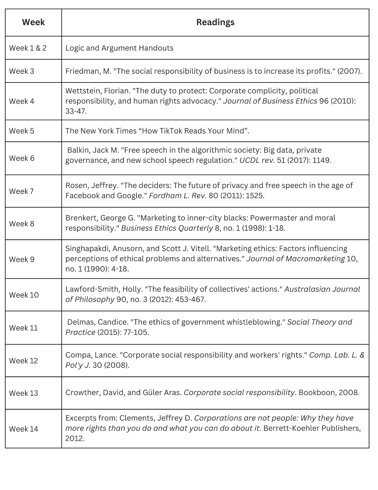 This course explores the principles and challenges of ethical decision-making in the corporate world. It emphasizes the importance of integrity, accountability, and social responsibility in building trust between businesses and their stakeholders. Through case studies, discussions, and practical exercises, we will analyze real-world scenarios of ethical dilemmas in areas such as marketing, finance, and human resources, and explore the concept of corporate social responsibility. My hope is that you will leave equipped with the critical thinking skills and ethical frameworks necessary to make principled decisions, align personal and organizational values, and foster a culture of integrity in professional environments.
