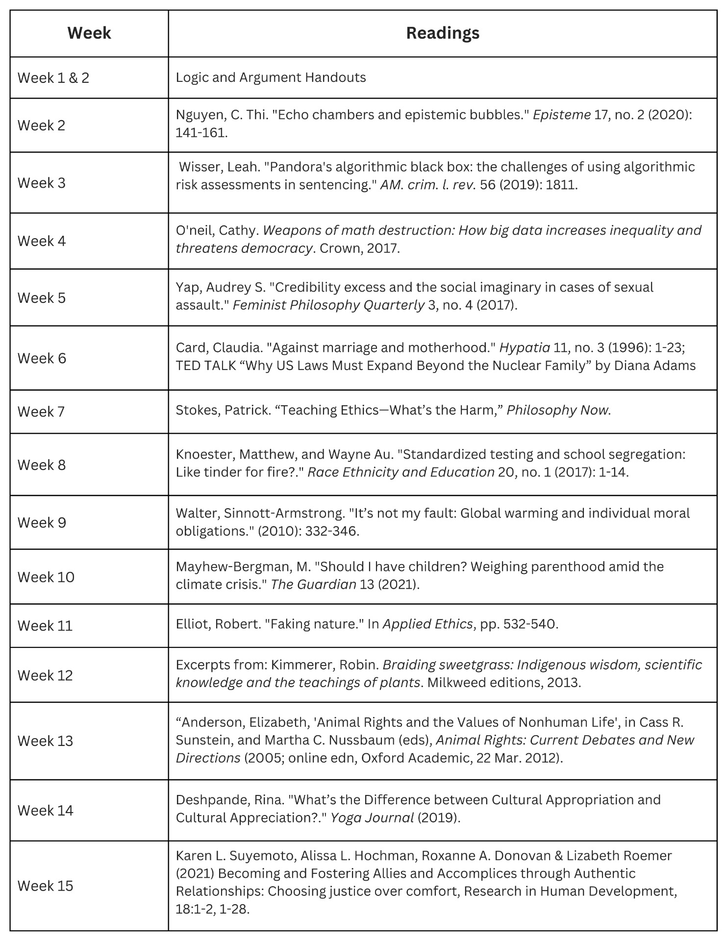 We will look at a number of ethical issues we are all faced with today including: echo chambers and epistemic bubbles, deplatforming, casual sex and promiscuity, prostitution, marriage, and the American justice system, just to name a few. This course is heavily influenced by you (the students), and while Laura and I have identified some topics to get us started, you will be selecting the ethical issues most interesting and relevant to you. This also extends to your assignments! We want this course to expose you to new ways of thinking about the issues you are already invested in.