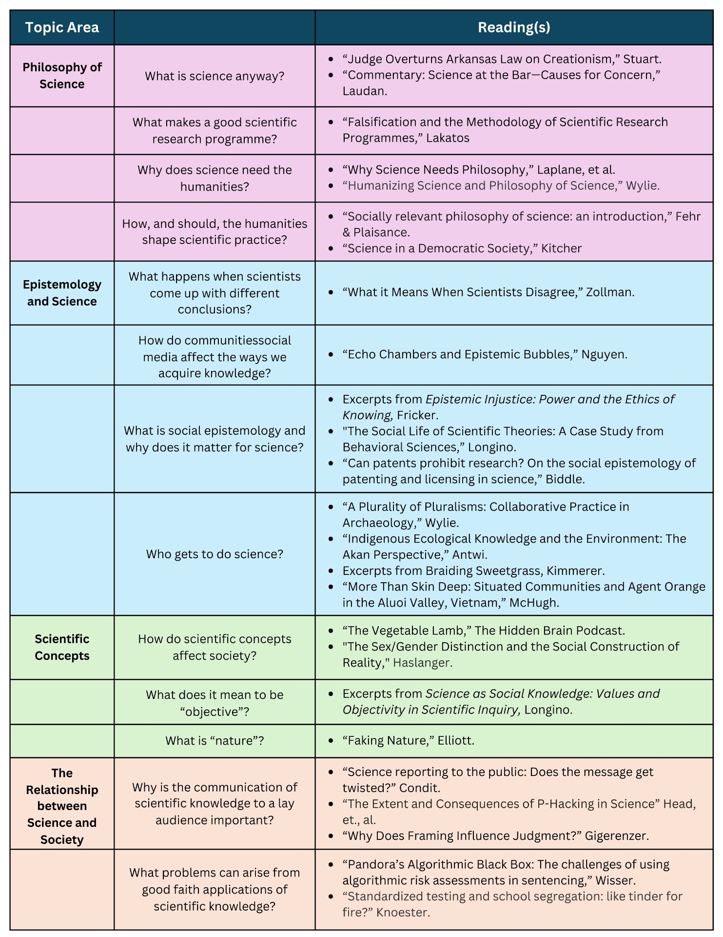 In this course we will be examining the nature of science and its epistemological underpinnings, specific scientific concepts (e.g., objectivity, evidence, certainty), procedural and ethical questions regarding the production and dissemination of scientific knowledge, and ethical dilemmas within particular sciences. All of these topics will be approached from a variety of standpoints that are designed to challenge you, provide a chance to reflect on the ways you think science ought to operate in society, and encourage you to develop well-reasoned positions on these crucial questions.[1]